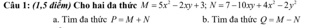 Câu 1: (1,5 điểm) Cho hai đa thức M = `5x^2 – 2xy + 3`; N =`7–10xy+C4x^2 – 2y^2`