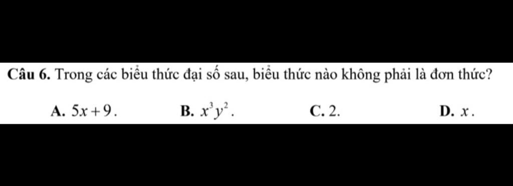Câu 6. Trong các biểu thức đại số sau, biểu thức nào không phải là đơn thức?