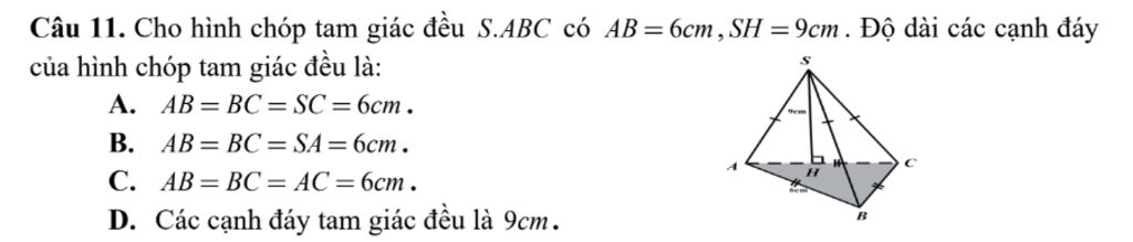 Câu 11. Cho hình chóp tam giác đều S.ABC có AB=6cm, SH =9cm . Độ dài các cạnh đáy của hình chóp tam giác đều là: