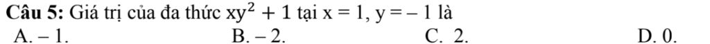Câu 5: Giá trị của đa thức `xy^2 +1` tại x=1, y= -1 là
