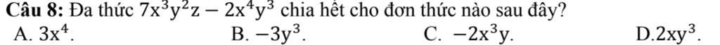 Câu 8: Đa thức `7x^3y^2z − 2x^4y^3` chia hết cho đơn thức nào sau đây?
