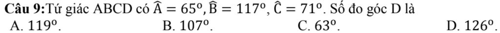 Câu 9:Tứ giác ABCD có góc A= 65°, B = 117°, C= 71° . Số đo góc D là