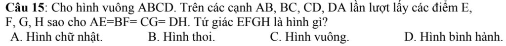 Câu 15: Cho hình vuông ABCD. Trên các cạnh AB, BC, CD, DA lần lượt lấy các điểm E, F, G, H sao cho AE=BF= CG=DH. Tứ giác EFGH là hình gì?