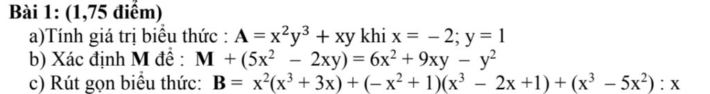 a) Tính giá trị biểu thức : A = `x^2y^3 + xy` khi x = – 2; y=1