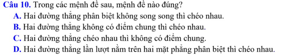 A. Hai đường thẳng phân biệt không song song thì chéo nhau.