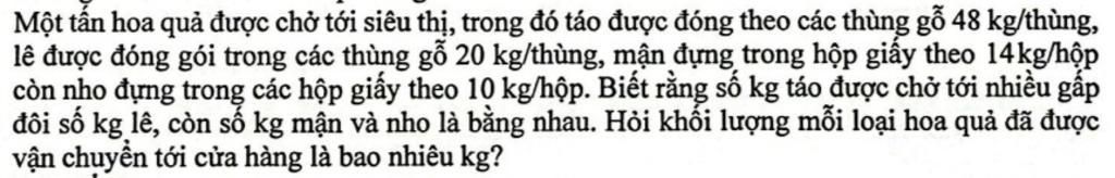 Gọi số lượng thùng táo, lê, mận, nho lần lượt là $a, b, c, d$ thùng, $(a,b,c,d\in N^*)$