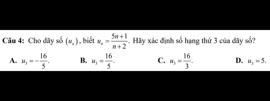 Câu 4: Cho dãy số `(u_n )`, biết `u_n = (5n+1)/(n+2)`