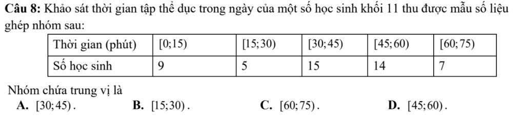 Câu 8: Khảo sát thời gian tập thể dục trong ngày của một số học sinh khối 11 thu được mẫu số liệu ghép nhóm sau:Nhóm chứa trung vị là