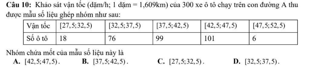Câu 10: Khảo sát vận tốc (dặm/h; 1 dặm = 1,609km) của 300 xe ô tô chạy trên con đường A thu được mẫu số liệu ghép nhóm như sau: Nhóm chứa mốt của mẫu số liệu này là