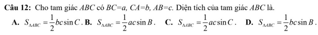 Câu 12: Cho tam giác ABC có BC=a, CA=b, AB=c. Diện tích của tam giác ABC là.