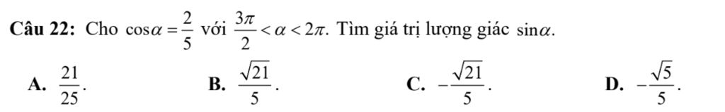 Câu 22: Cho cos a = `2/5 `với $\dfrac{3π}{2}$<`a<2π`. Tìm giá trị lượng giác sin a.