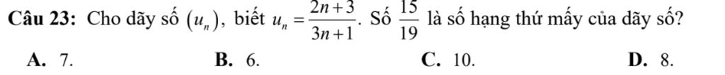 Câu 23: Cho dãy số ($u_n$), biết $_n$ = $\dfrac{2n + 3}{3n +1}$. Số `15/19` là số hạng thứ mấy của dãy số?