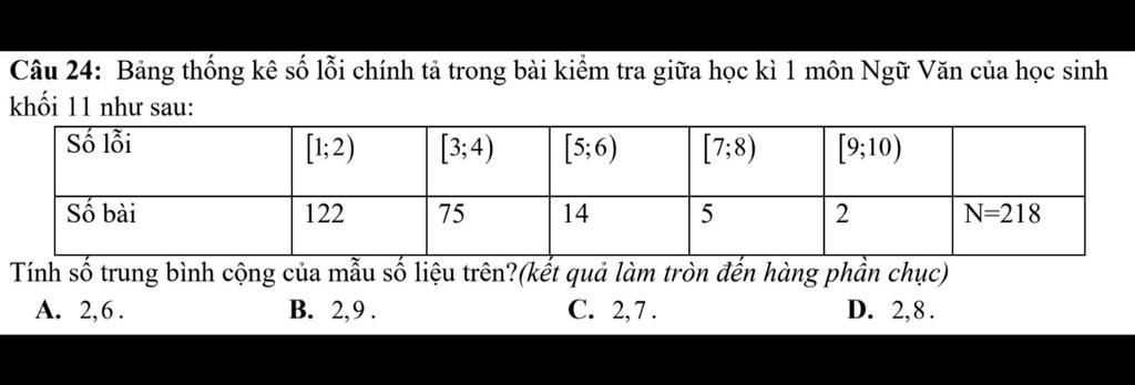 Câu 24: Bảng thống kê số lỗi chính tả trong bài kiểm tra giữa học kì 1 môn Ngữ Văn của học sinh khối 11 như sau: Tính số trung bình cộng của mẫu số liệu trên?(kết quả làm tròn đến hàng phần chục)