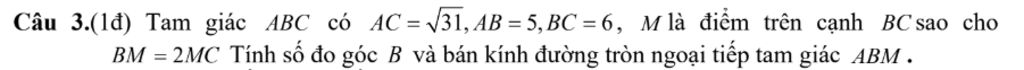 Câu 3. (1đ) Tam giác ABC có AC = $\sqrt{31}$, AB = 5, BC = 6, M là điểm trên cạnh BC sao cho BM = 2MC. Tính số đo góc B và bán kính đường tròn ngoại tiếp tam giác ABM.