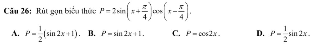 Câu 26: Rút gọn biểu thức P=`2sin (x+ π/4) cos (x-π/4)`