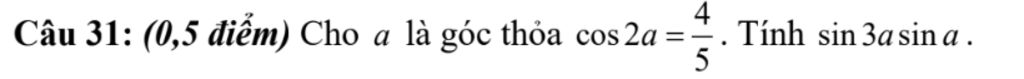 Câu 31: (0,5 điểm) Cho a là góc thỏa cos2a = `4/5`. Tính sin 3a.sin a