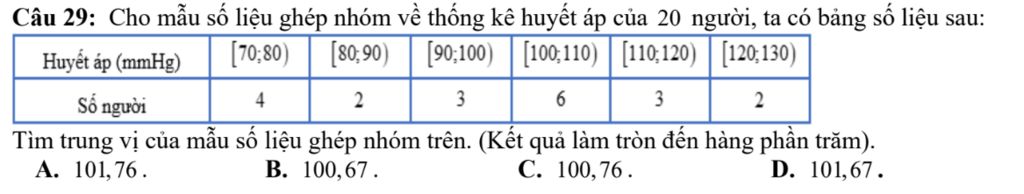 Câu 29: Cho mẫu số liệu ghép nhóm về thống kê huyết áp của 20 người, ta có bảng số liệu sau: Tìm trung vị của mẫu số liệu ghép nhóm trên. (Kết quả làm tròn đến hàng phần trăm).