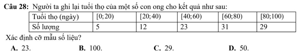 Câu 28: Người ta ghi lại tuổi thọ của một số con ong cho kết quả như sau: