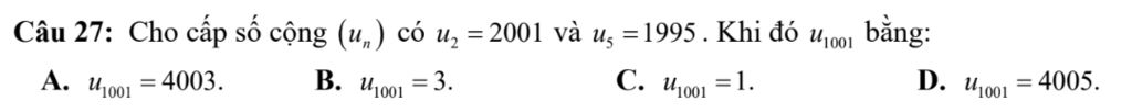 Câu 27: Cho cấp số cộng (`u_n`) có `u_2` =2001 và `u_5` =1995 . Khi đó to bằng: