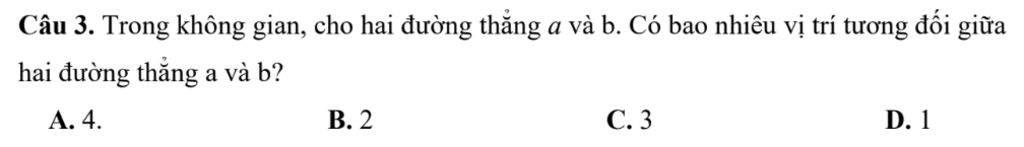 Câu 3. Trong không gian, cho hai đường thẳng a và b. Có bao nhiêu vị trí tương đối giữa hai đường thẳng a và b?
