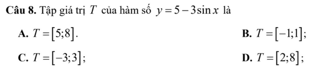 Câu 8. Tập giá trị T của hàm số `y=5–3sin x` là