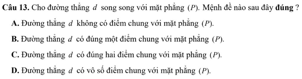 Câu 13. Cho đường thẳng d song song với mặt phẳng (P). Mệnh đề nào sau đây đúng ?