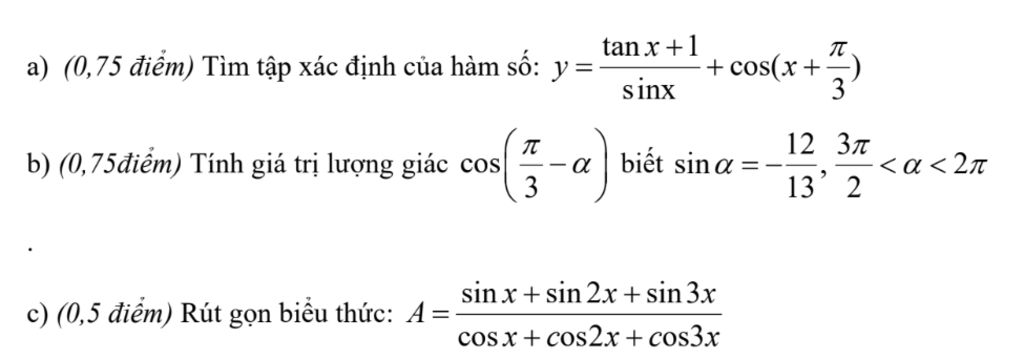a) (0,75 điểm) Tìm tập xác định của hàm số: y= `(tan x+1) / (sinx)` + cos`(x+π/3)`