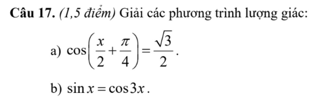 Câu 17. (1,5 điểm) Giải các phương trình lượng giác: