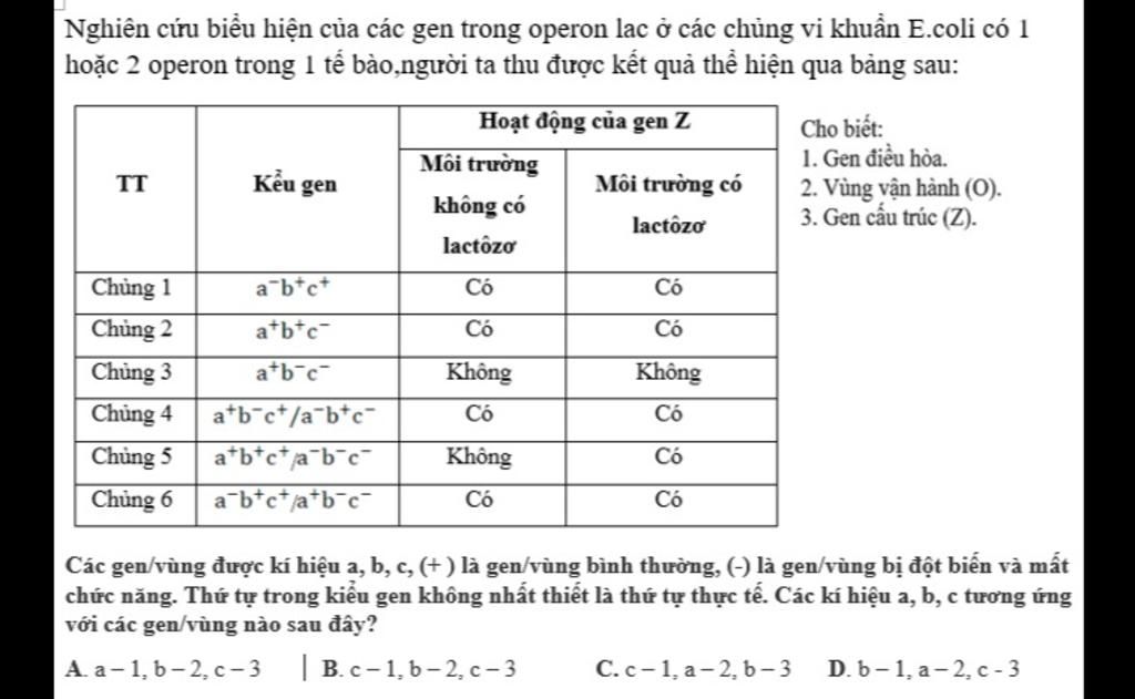 hoặc 2 operon trong 1 tế bào,người ta thu được kết quả thể hiện qua bảng sau: