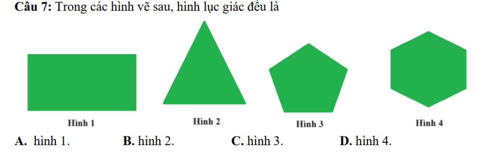 Câu 7: Trong các hình vẽ sau, hình lục giác đều là