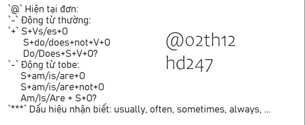 Dấu hiệu nhận biết: Always, usually, sometimes, seldom, never, hardly, everyday, everyweek, every year, every morning, once a day, twice a day, ...