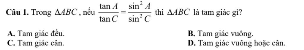 Câu 1. Trong tam giác ABC, nếu `(tan A)/(tan C) = (sin²A)/(sin²C)` thì tam giác ABC là tam giác gì?