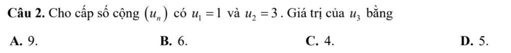 Câu 2. Cho cấp số cộng (`u_n`) có `u_1` =1 và `u_2` =3 . Giá trị của `u_3` bằng
