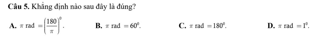 `\pi rad = 180^0` (nửa vòng tròn trong đường tròn lượng giác)