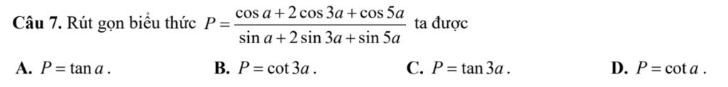 Câu 7. Rút gọn biểu thức P = `(cos a +2cos 3a + cos 5a)/(sin a + 2sin 3a + sin 5a)` ta được