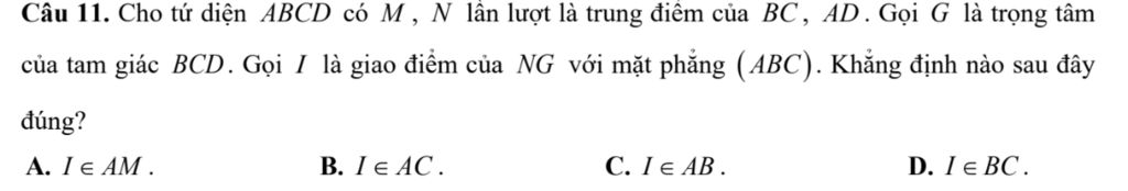 Câu 11. Cho tứ diện ABCD có M, N lần lượt là trung điểm của BC, AD. Gọi G là trọng tâm của tam giác BCD. Gọi I là giao điểm của NG với mặt phẳng (ABC). Khẳng định nào sau đây đúng?