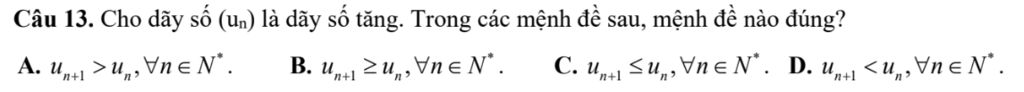 Câu 13. Cho dãy số (`u_n`) là dãy số tăng. Trong các mệnh đề sau, mệnh đề nào đúng?