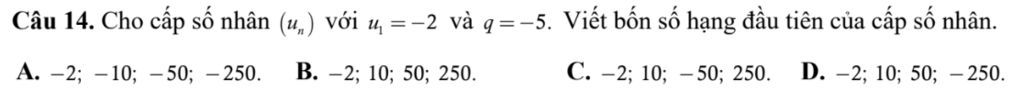 Câu 14. Cho cấp số nhân (`u_n`) với `u_1` = −2 và q=−5. Viết bốn số hạng đầu tiên của cấp số nhân. A. -2; 10; 50; -2250