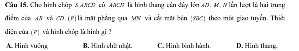 Câu 15. Cho hình chóp S.ABCD có ABCD là hình thang cân đáy lớn AD. M, N lần lượt là hai trung điểm của AB và CD. (P)là mặt phẳng qua MN và cắt mặt bên (SBC) theo một giao tuyến. Thiết diện của (P) và hình chóp là hình gì?
