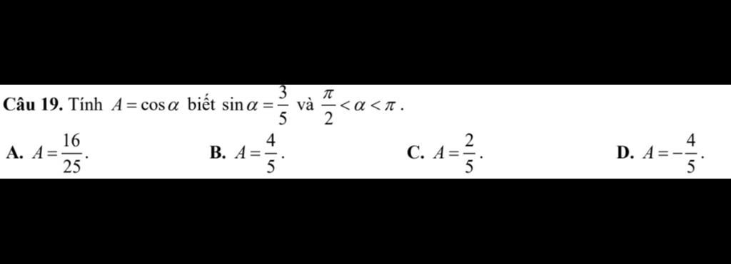 Câu 19. Tính A=cosα biết sin α = `3/5` và `π/2<α<π`