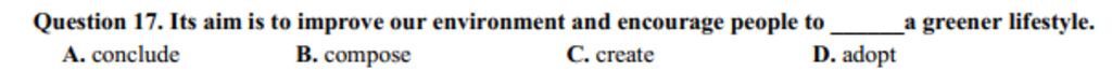 Question 17. Its aim is to improve our environment and encourage people to....a greener lifestyle.