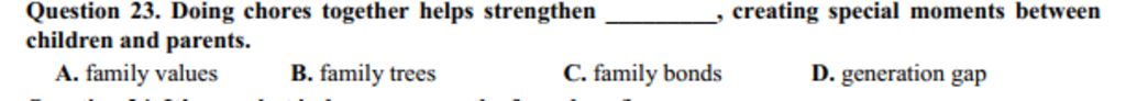 Question 23. Doing chores together helps strengthen....., creating special moments between children and parents.