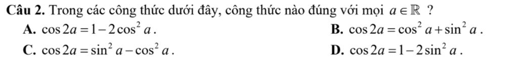 Câu 2. Trong các công thức dưới đây, công thức nào đúng với mọi a =