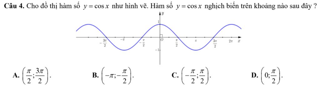 Câu 4. Cho đồ thị hàm số y= cosx như hình vẽ. Hàm số y= cosx nghịch biến trên khoảng nào sau đây ?