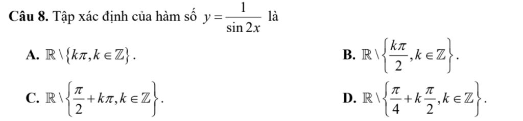 Câu 8. Tập xác định của hàm số `1/ (sin2x)` là