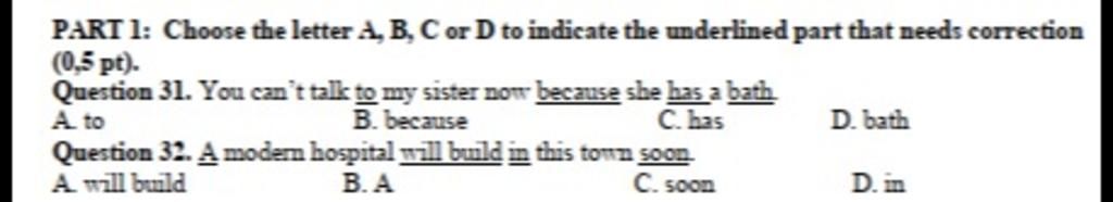 PART 1: Choose the letter A, B, C or D to indicate the underlined part that needs correction