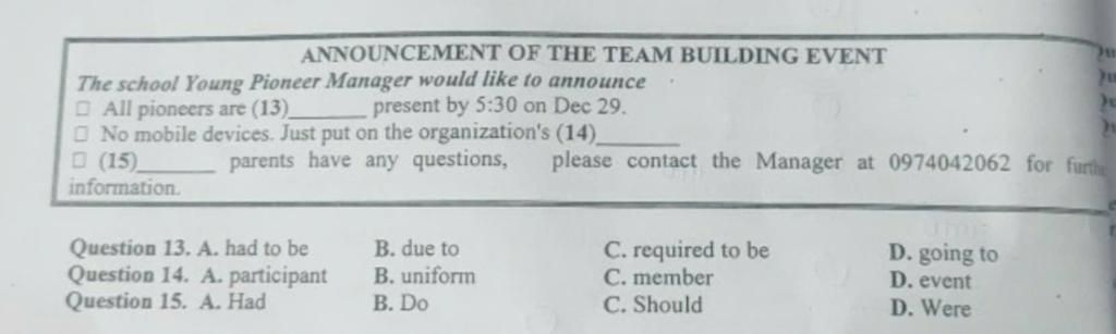 `-` Ta có cụm từ cố định : put on uniform : mặc lên đồng phục (V)