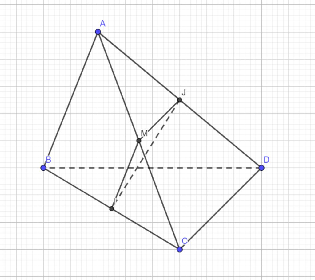 Vì I,J là trung điểm BC, AD$\to MJ,MI$ là đường trung bình $\Delta ACD,ACB$