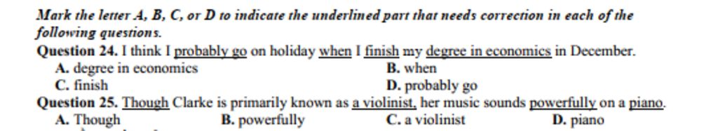 Question 24. I think I probably go on holiday when I finish my degree in economics in December.