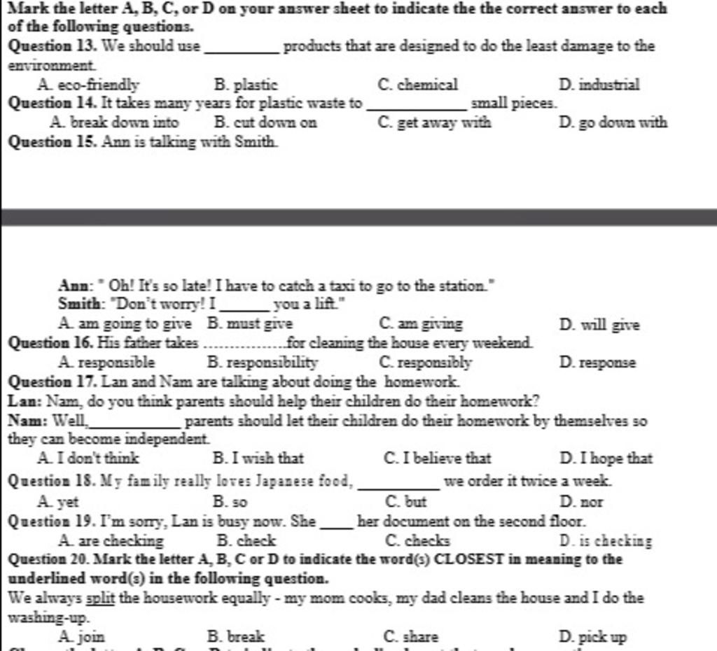 Question 17. Lan and Nam are talking about doing the homework.